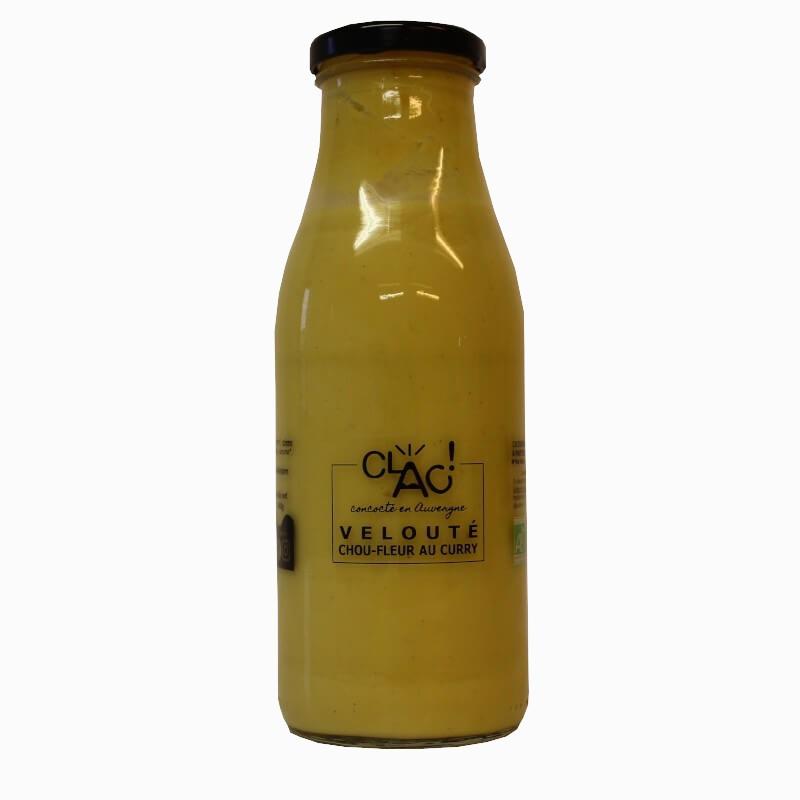 Ingrédients : Eau, chou-fleur (47,5%), pomme de terre, crème fraîche, huile de tournesol, sel, farine de guar, curry (0,25%), curcuma, poivre blanc.