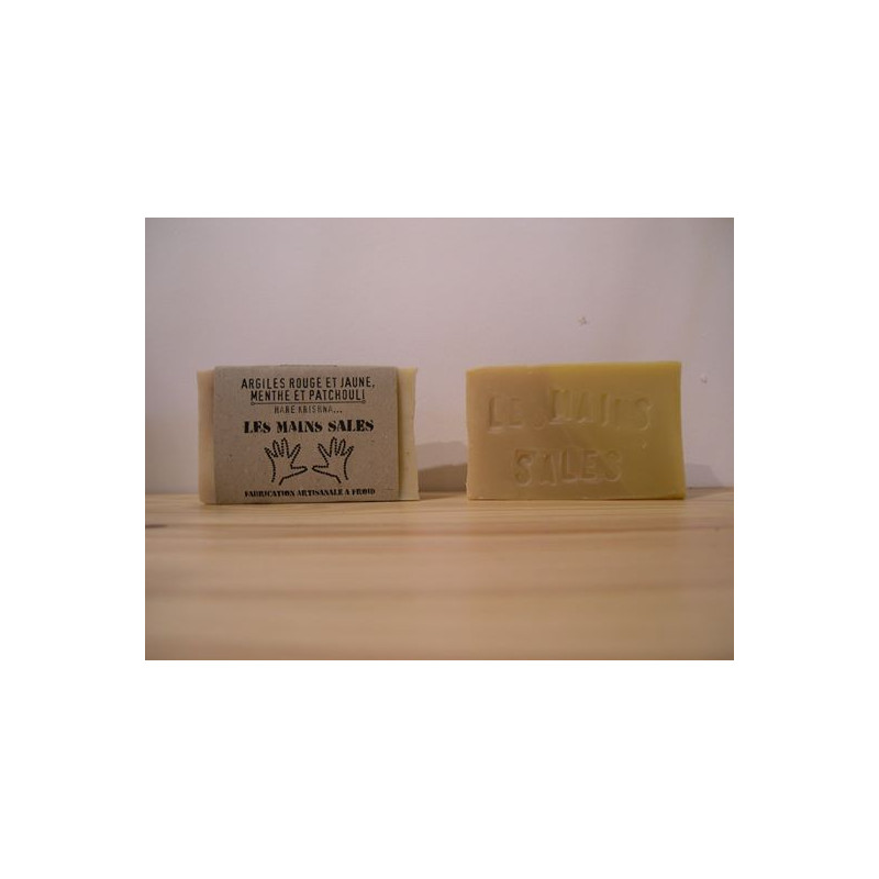Savon apaisant pour tous types de peaux, à base d’huiles d’olive, coco et cameline, argiles rouge et jaune. Surgras 5%