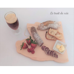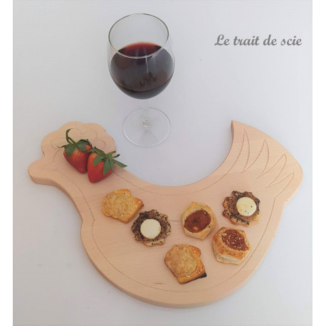 Planche forme "poule" en hêtre (bois alimentaire) massif, lamellé collé, non traité. Idéal pour les apéros en famille, entre amis, en toute convivialité. Elle peut servir aussi comme planche à découper.