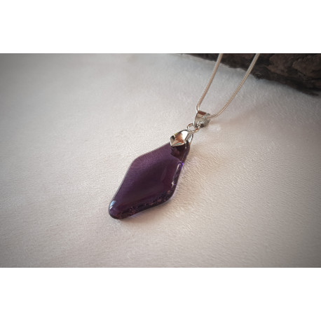 La chaîne qui accompagne le bijou est en argent 925, la bélière en acier inoxydable (pour plus de solidité ) et le pendentif est en verre de vitrail de couleur violet. Le collier sera envoyé dans son petit sachet de velours noir.