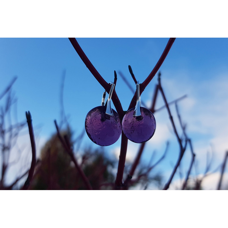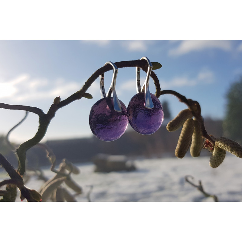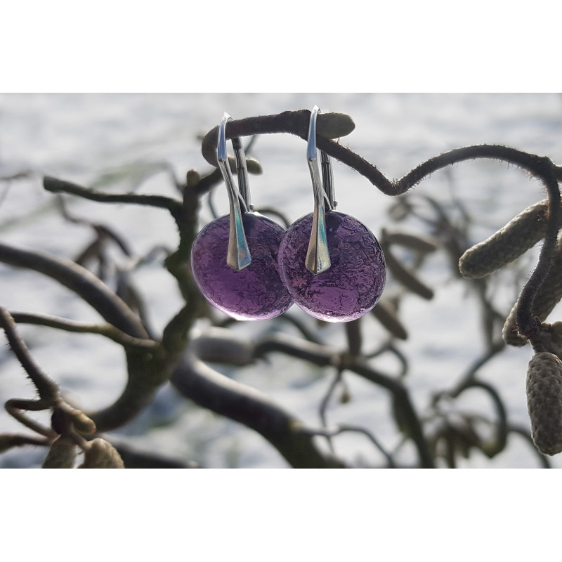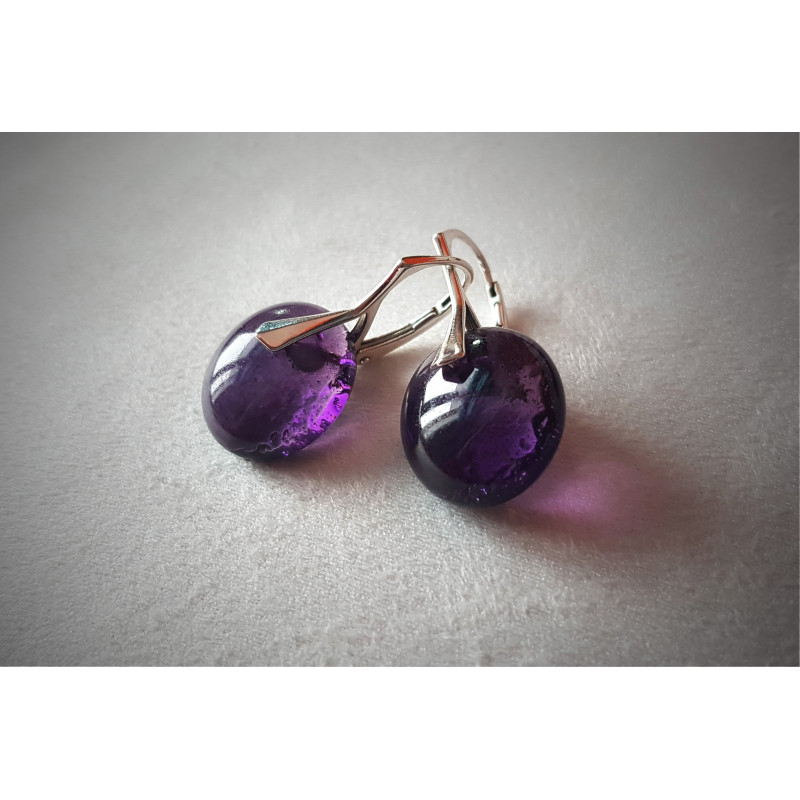 Les boucles doreilles en verre de vitrail de couleur violet sont montées sur des dormeuses en argent 925. Elles seront envoyées dans leur petit sachet de velours noir.