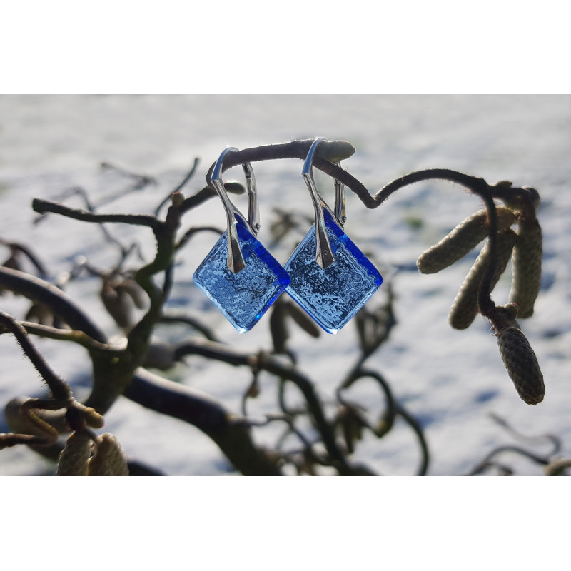 Les boucles doreilles en verre de vitrail de couleur bleu lavande sont montées sur des dormeuses en argent 925. Elles seront envoyées dans leur petit sachet de velours noir.