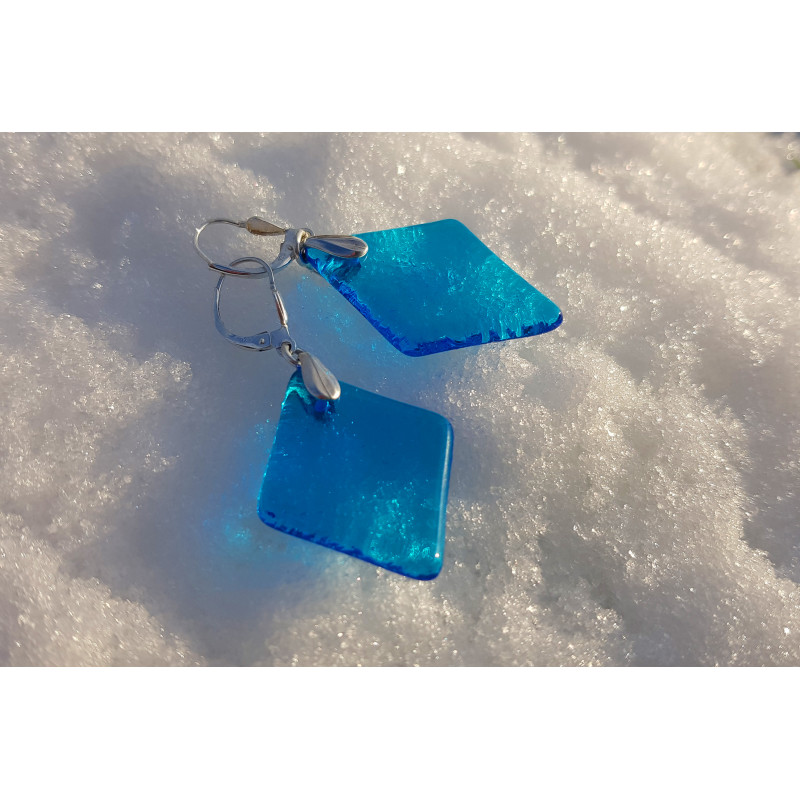 Les boucles doreilles en verre de vitrail de couleur bleu turquoise sont montées sur des dormeuses en argent 925. Elles seront envoyées dans leur petit sachet de velours noir.