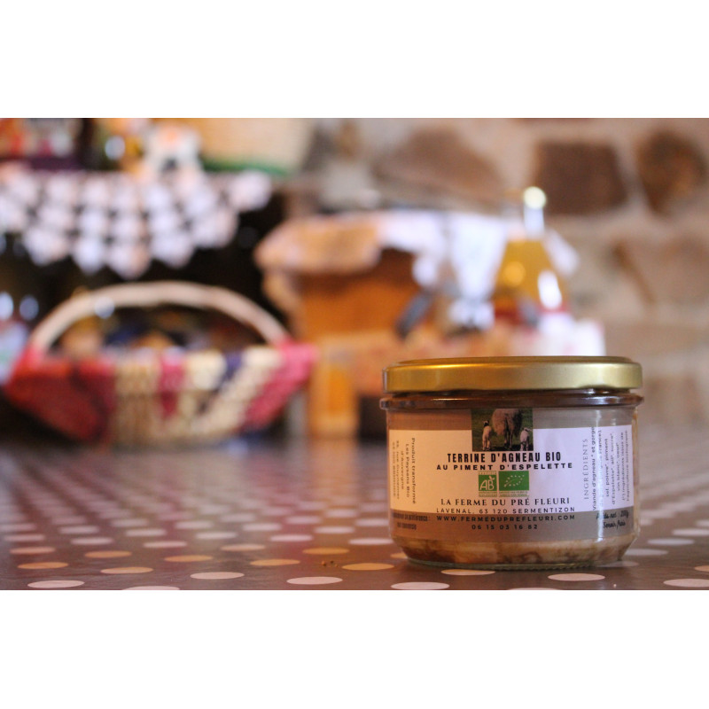 Terrine d’agneau BIO au Piment d’Espelette, sans colorants ni conservateurs, pot de 200g. Agneau local de race Rava élevé à la ferme en Auvergne en agriculture biologique.