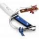 Le sabre à champagne Lassalle possède un manche bleu et sa garde est recouverte d'argent.