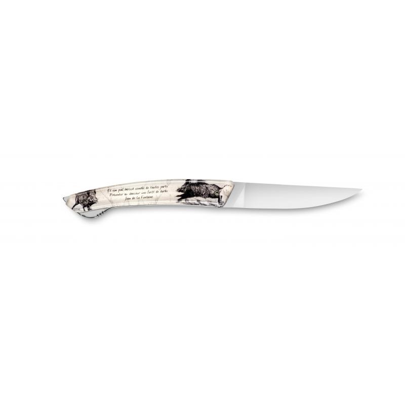Son manche en Cristallium, un verre de synthèse qui ne ternit pas, est gravé de motifs comme la truite, le cerf, le sanglier ou la bécasse.