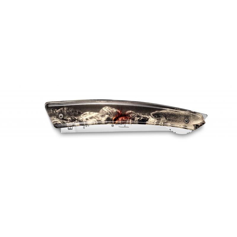 Son manche est en Cristallium, décoré de différentes gravures qui rappellent l'univers de la chasse et de la pêche : Truite, cerf, sanglier, bécasse. Sa lame est conçue dans un acier très haut de gamme.