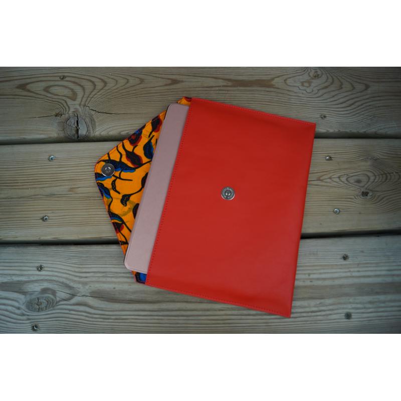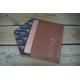 Housse de tablette en cuir avec doublure en tissu de différents motifs.