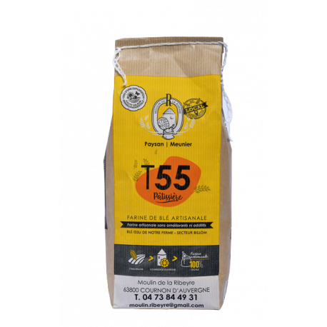 Farine traditionnelle artisanale T55, 1 kg, sans améliorants ni additifs, issue du blé de notre exploitation céréalière située sur le secteur de Billom.