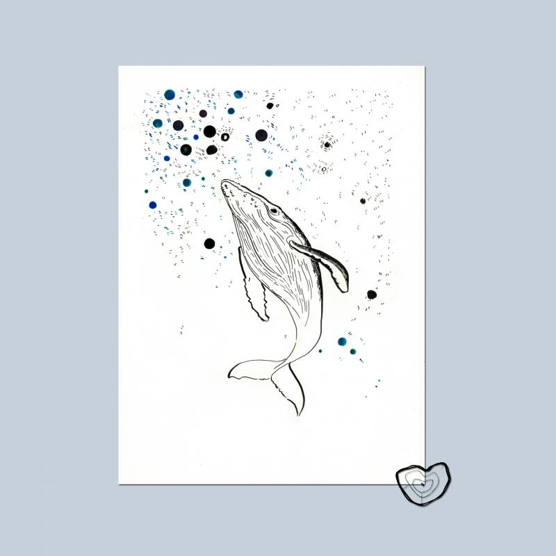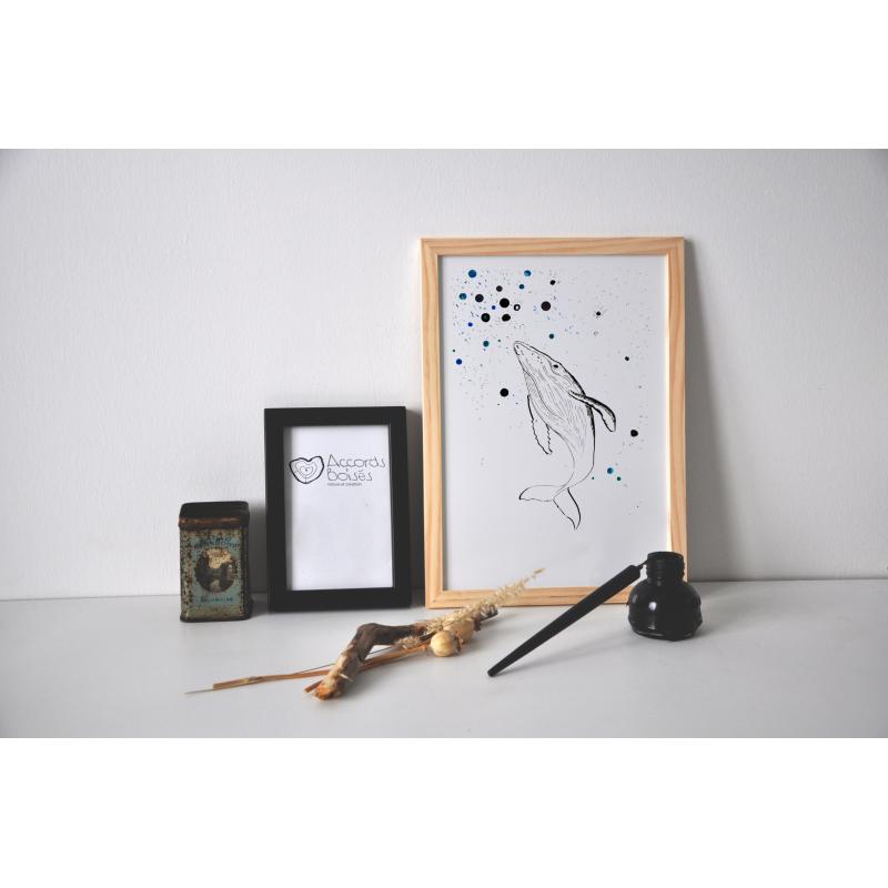 Affiche Baleine, impression format A4 d'une illustration en noir et couleur, pour décoration intérieure calme et poétique.