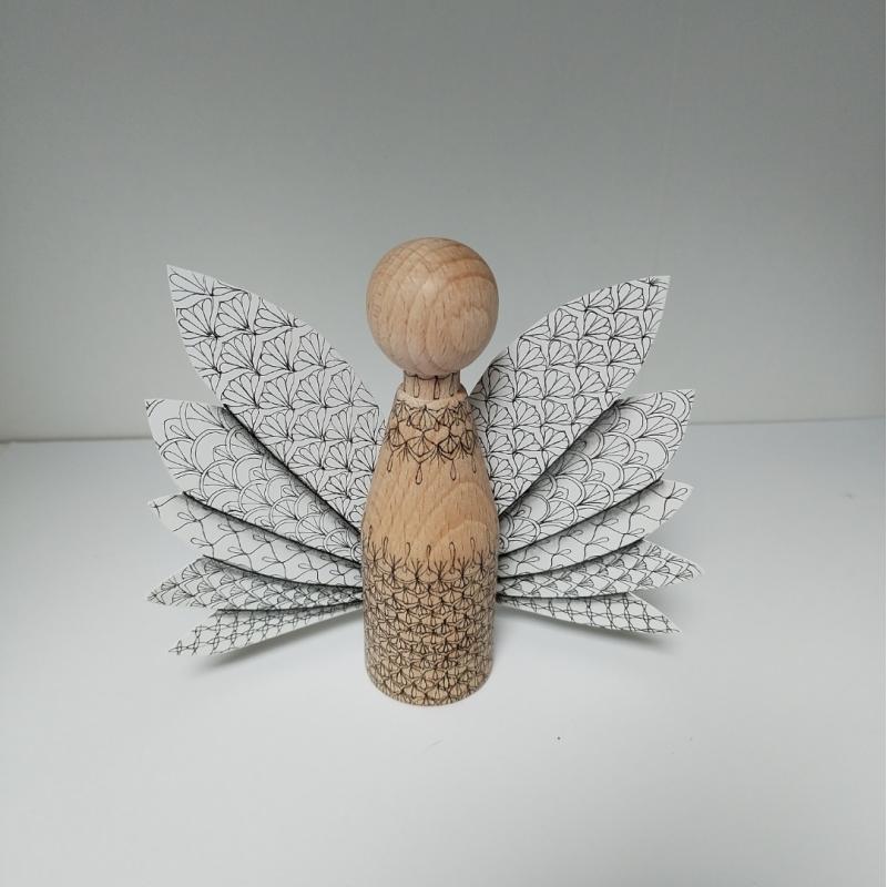 Ange en bois et ailes papier dessiné. Dim 10 x 12 cm.