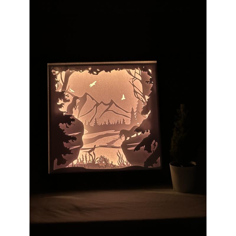 Plongez dans un paysage montagnard enchanté avec ce cadre lumineux Loutres. Cette création artisanale sublime met en scène une famille de loutres, chacune jouant son rôle dans ce tableau naturel.