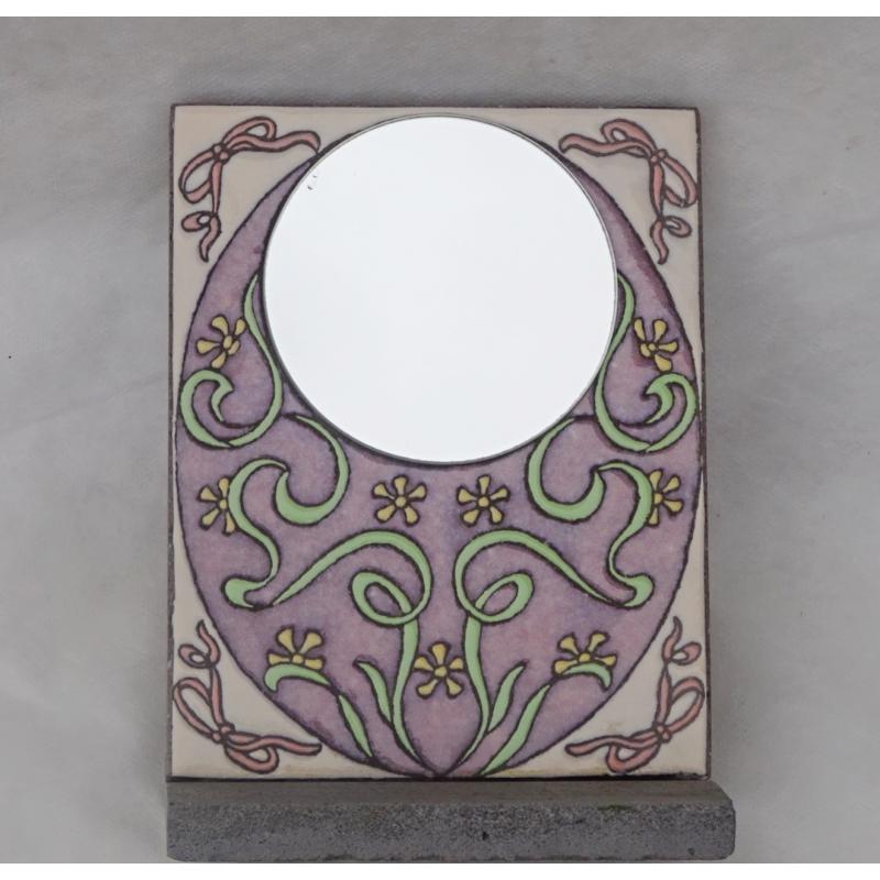 Un miroir à poser sur un meuble (il est soutenu par un support) : le miroir rond est collé sur une lave émaillée au décor de fleurs de jasmin, sur un fond roses, dimensions env. 15x19cm. Création unique et faite avec passion par l'artisan émailleur sur lave. Un souhait de personnalisation? Une question concernant la livraison? N'hésitez pas à contacter l'artisan en direct au 06.02.13.24.59 ou par mail : emailetmerveilles@gmail.com
