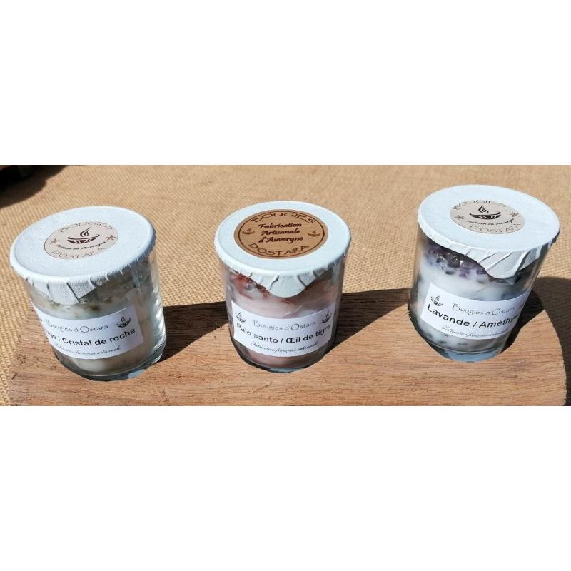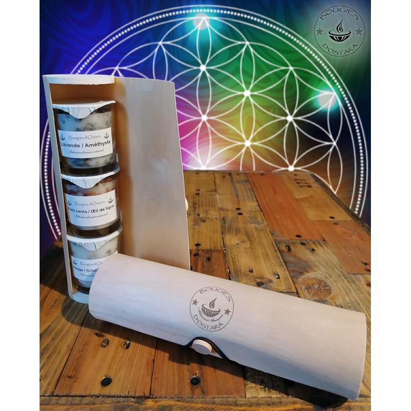 Pour offrir ou pour vous offrir nous vous proposons notre trio de bougies en petit modèle (lavande/améthyste, sauge/cristal de roche et Palo Santo / œil de tigre) dans ce bel étui en bois en forme de rouleau.