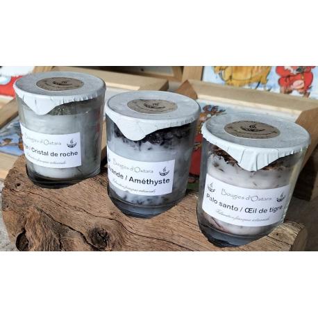 Pour offrir ou pour vous offrir nous vous proposons notre trio de bougies énergétiques (lavande/améthyste, sauge/cristal de roche et Palo Santo /œil de tigre) sur une jolie bûche en bois qui le mettra en valeur