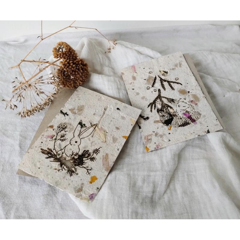 Carte postale à planter - dentelle de papier. Illustration gravée sur papier recyclé ensemencé et pailleté de pétales et de feuilles séchées, cueillies en Auvergne.