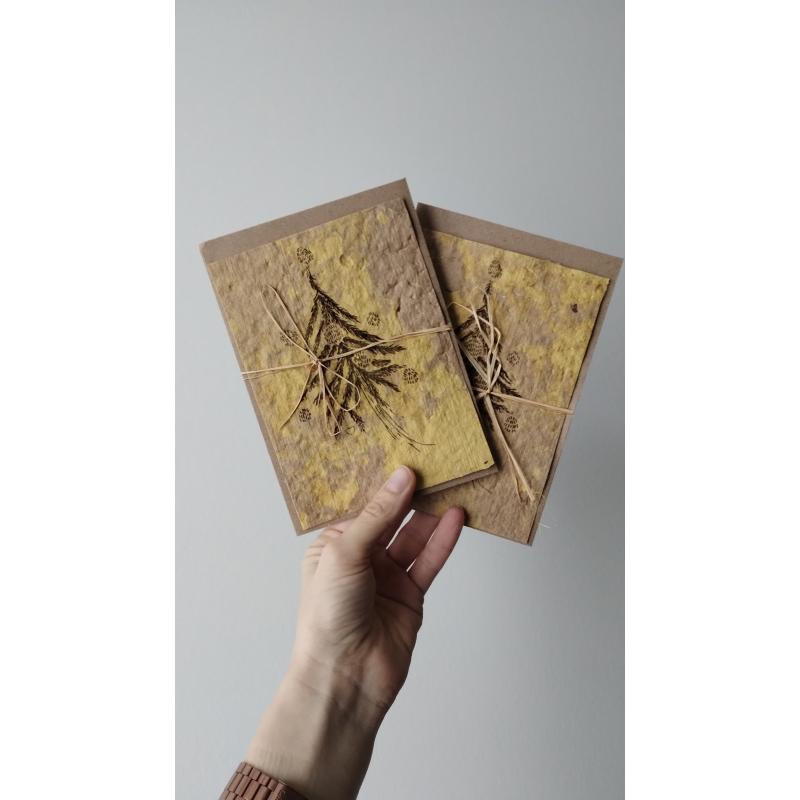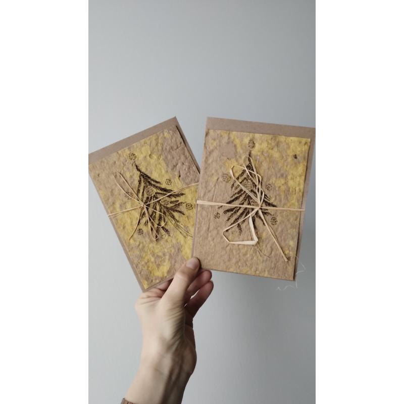 Carte de voeux avec gravure d'une illustration sapin de Noël, sur papier recyclé, avec son enveloppe en papier kraft.