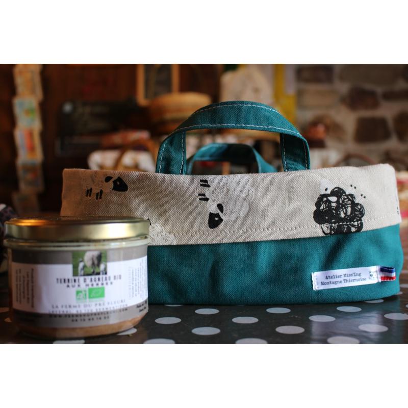 Petit panier BIO composé de 3 terrines BIO à offrir ou à s'offrir. Panier tissu confectionné localement 100% made in auvergne.