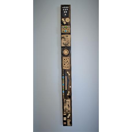 Sur support en sapin brulé brossé naturel, les motifs divers et variés sont collés
