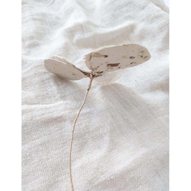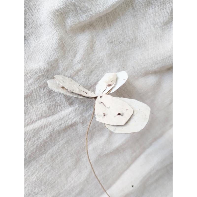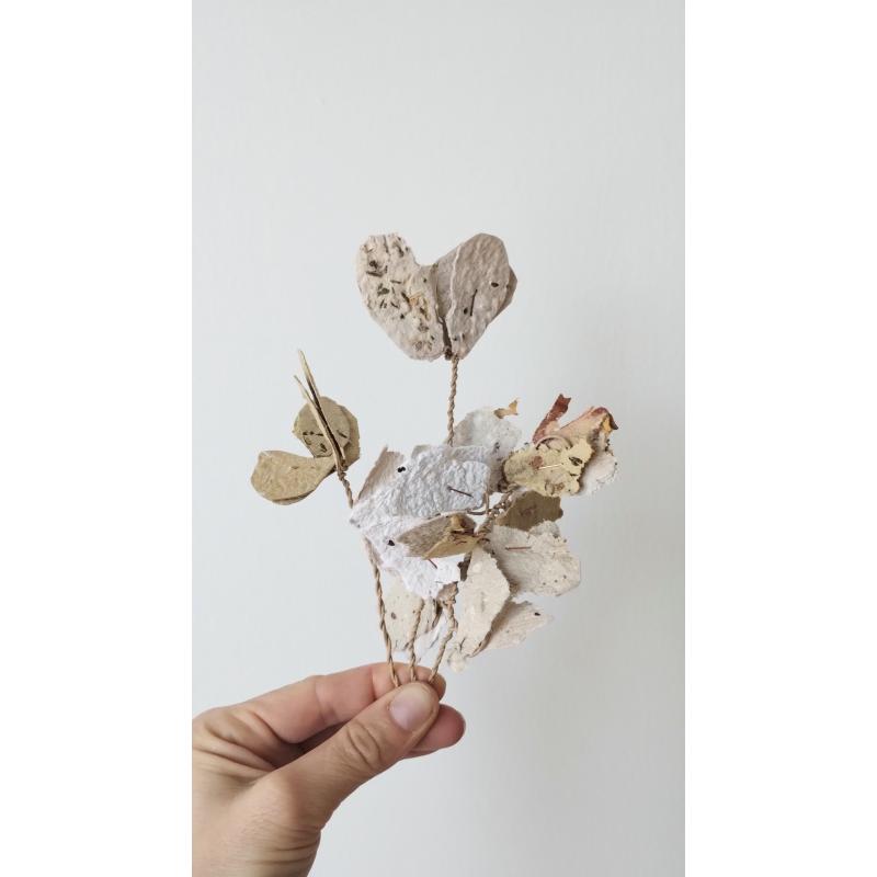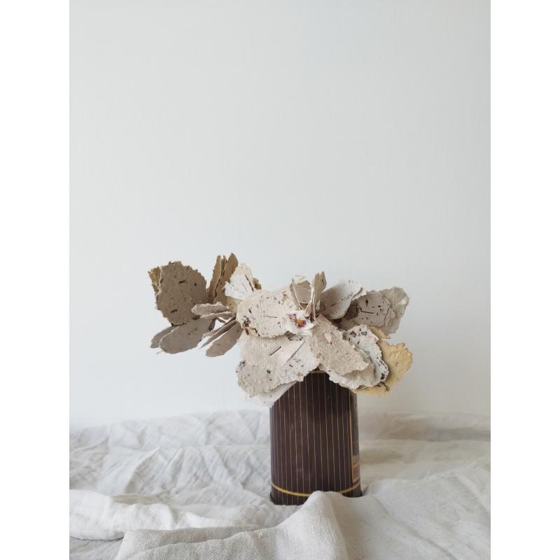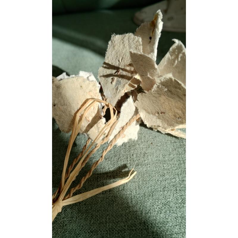 Pétales et feuillages en papiers recyclés ensemencés, façonnés à l'atelier. Le papier est réalisé de manière artisanale à la main, à partir de papiers et cartons voués au déchets. Ceci dans une démarche éco-responsable de prise en compte de l'environnement comme de sensibilisation au tri et à la revalorisation des déchets. Selon les papiers et cartons ayant servis à la réalisation des feuilles, les cartes auront des teintes différentes. De nouvelles teintes peuvent être créées à l'aide d'encres végétales réalisées à l'atelier. Le papier comportent des irrégularités de part la manière dont il à été fabriqué.