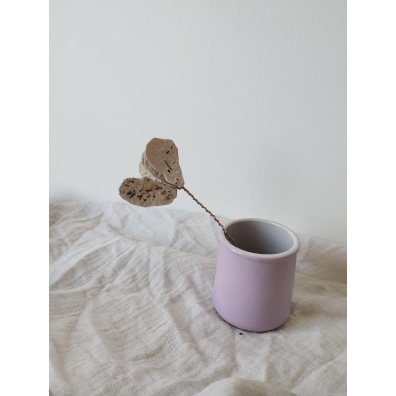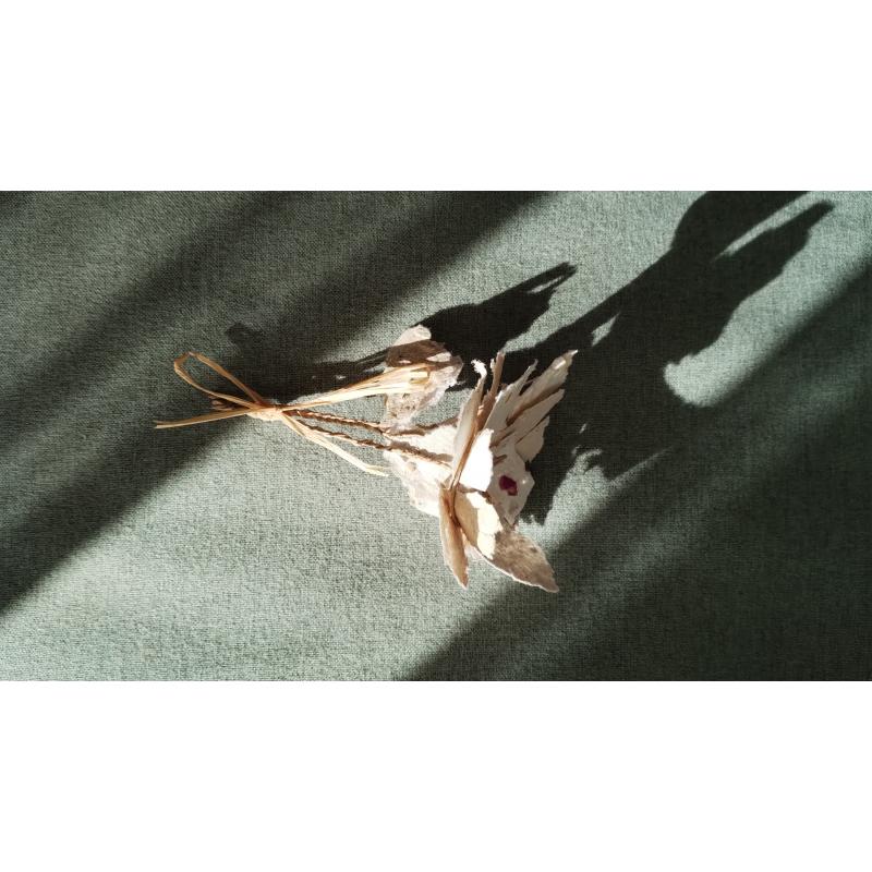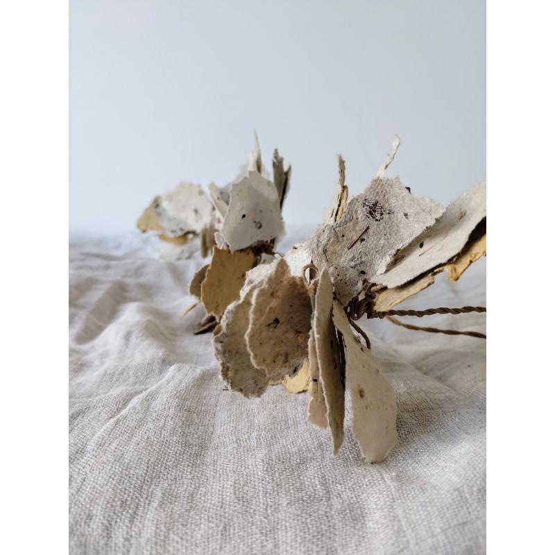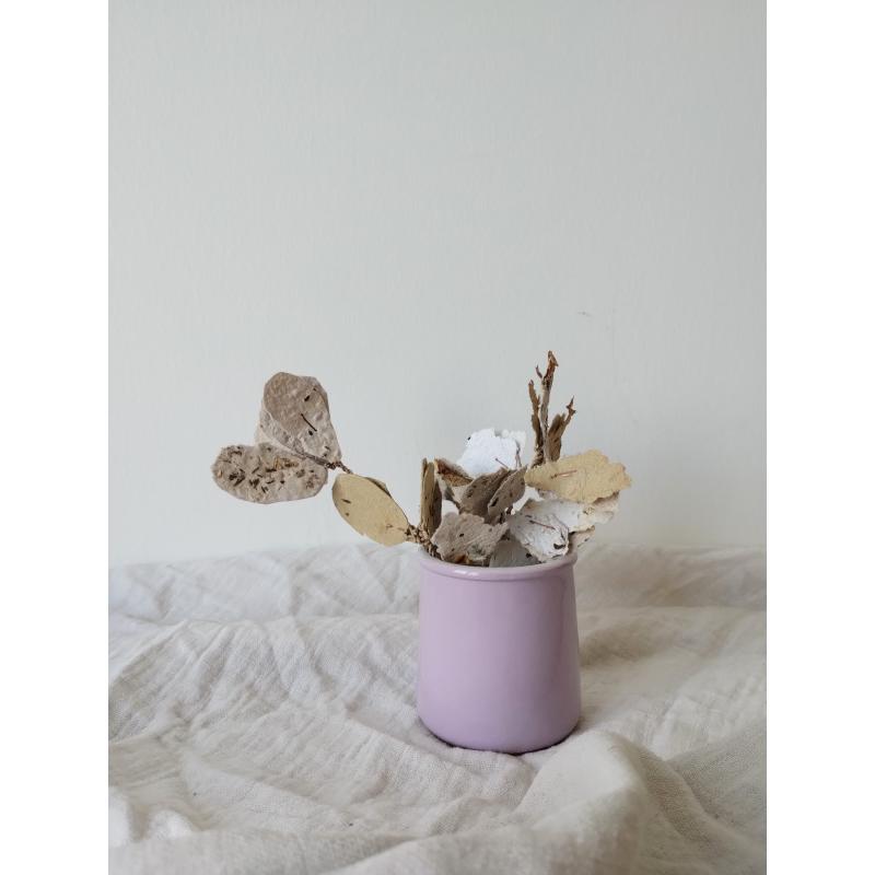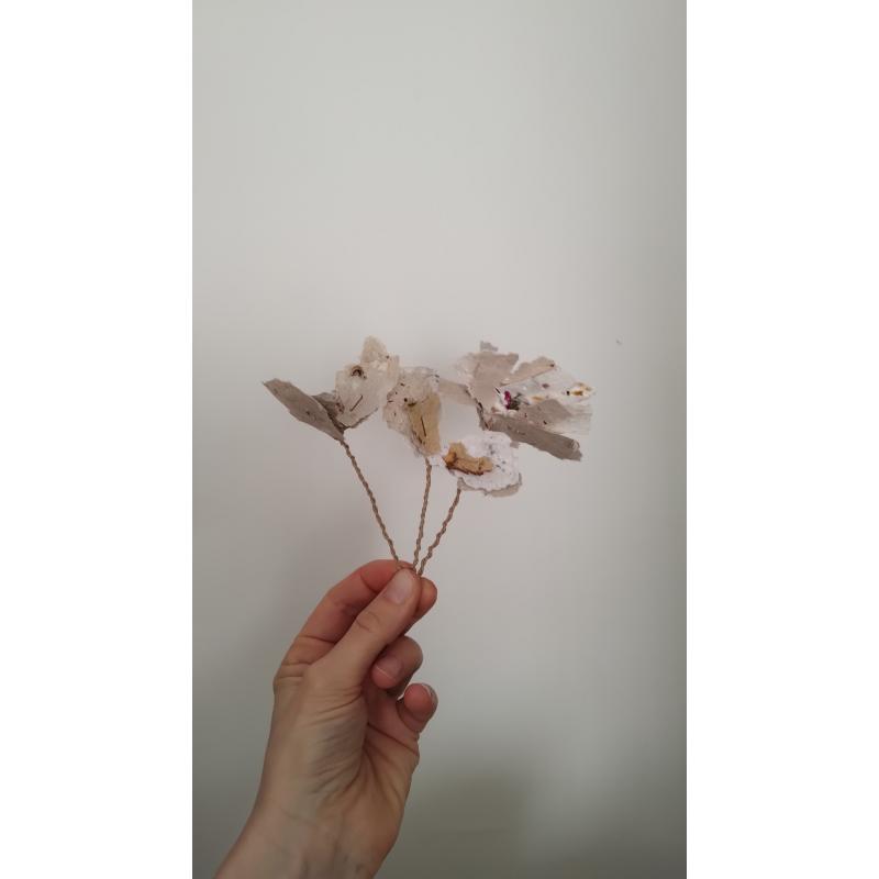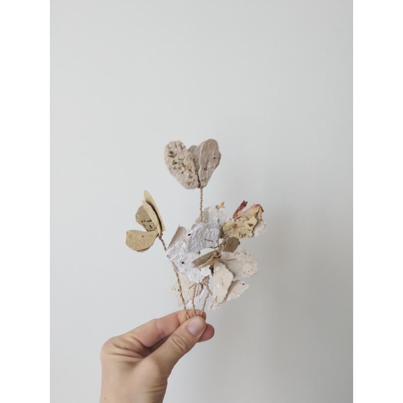 Pétales et feuillages en papiers recyclés ensemencés, façonnés à l'atelier. Le papier est réalisé de manière artisanale à la main, à partir de papiers et cartons voués au déchets. Ceci dans une démarche éco-responsable de prise en compte de l'environnement comme de sensibilisation au tri et à la revalorisation des déchets. Selon les papiers et cartons ayant servis à la réalisation des feuilles, les cartes auront des teintes différentes. De nouvelles teintes peuvent être créées à l'aide d'encres végétales réalisées à l'atelier. Le papier comportent des irrégularités de part la manière dont il à été fabriqué.
