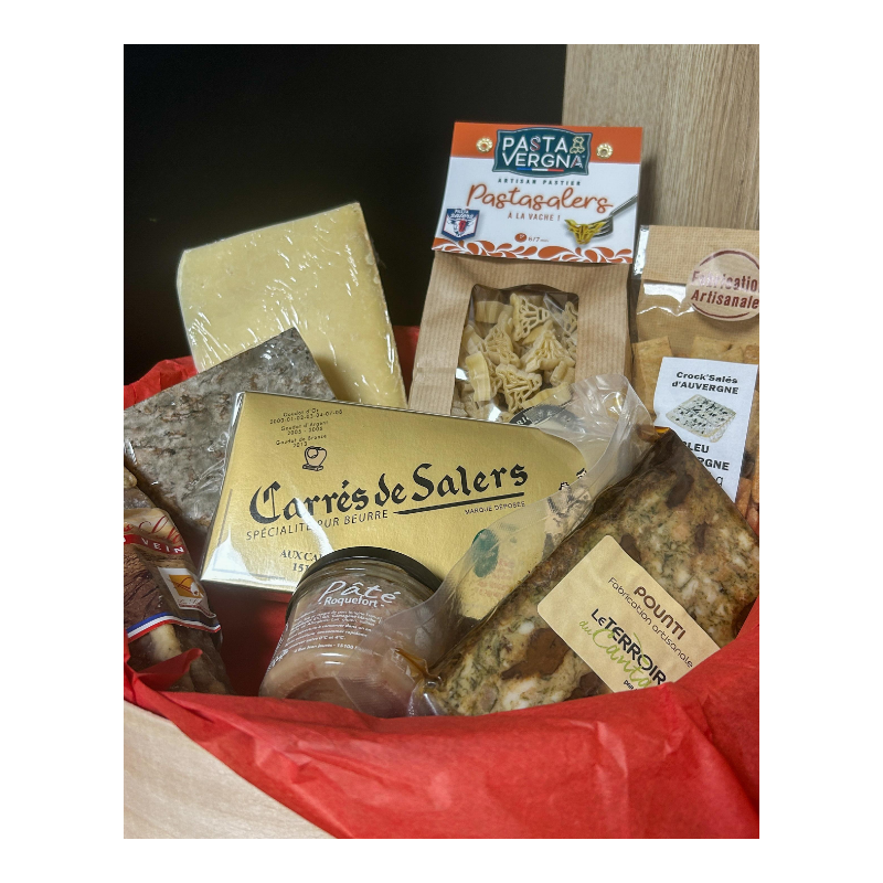 Offrez un voyage gourmand au cœur du Cantal avec notre Box Cadeau Terroir "Saveurs du 15", une sélection artisanale de produits emblématiques de l’Auvergne. Fromages AOP, charcuterie, spécialités locales et douceurs sucrées réunis dans une élégante box en bois. Un cadeau 100% terroir, 100% authentique.