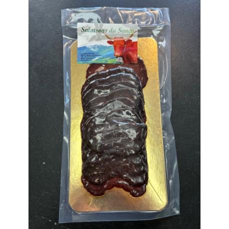 Notre Boeuf salers séchée est fabriquée dans nos ateliers de Besse et Saint-Anastaise avec de la viande issue de la région. 100% boeuf, et très peu gras, il accompagnera idéalement vos planches apéritives et pique-niques.