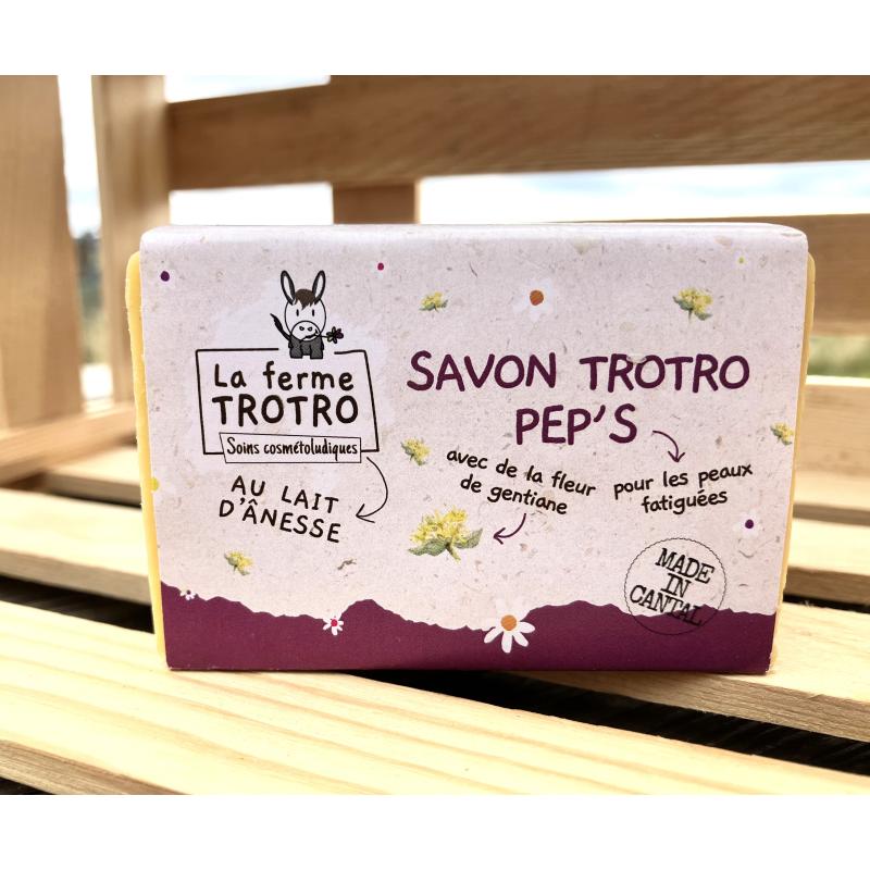 Savon Trotro Pep's au lait d'ânesse, avec de la gentiane tonifiante, idéal pour les peaux fatiguées.