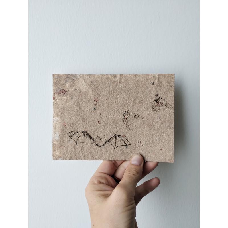 Carte postale motif chauve-souris, brûlé sur papier recyclé fait à la main.