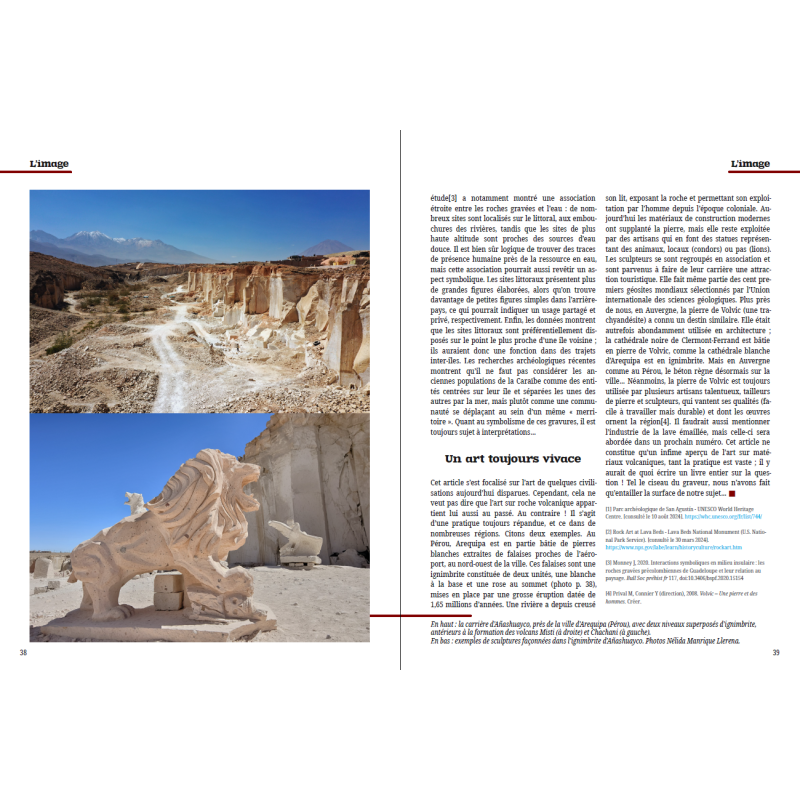 Pour une fois, le volcan n’est pas le sujet de la rubrique artistique, il en est le support ! À la fois faciles à travailler et résistantes, les roches volcaniques constituent un matériau de choix à peindre, graver ou sculpter, ce qu’ont fait plusieurs civilisations millénaires.