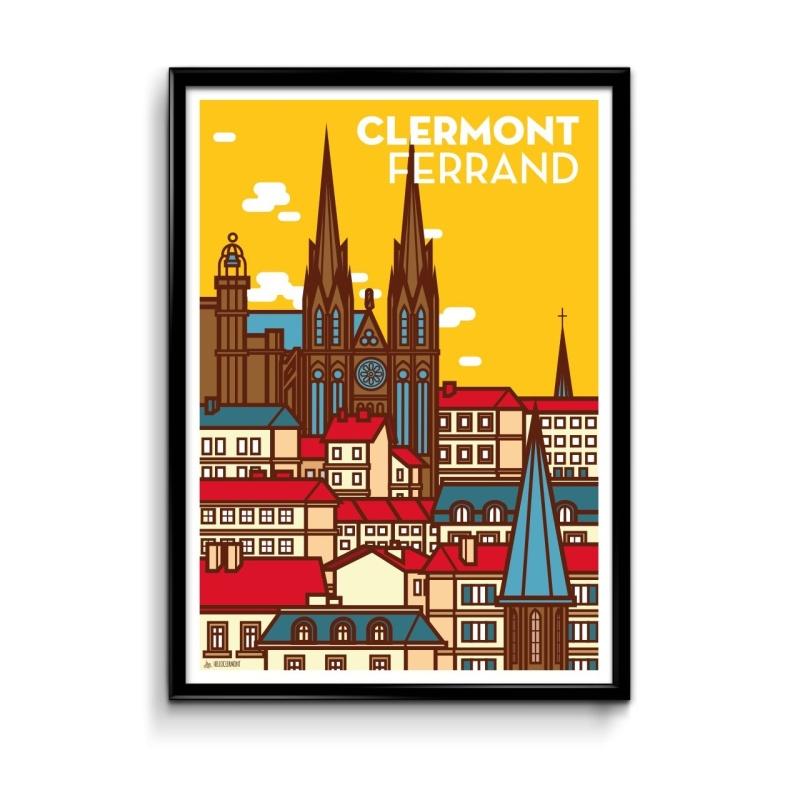 Découvrez cette illustration pop et chaleureuse avec son fond jaune sur la ville de Clermont-Ferrand et sa cathédrale. Parfaite pour décorer un bureau ou votre maison de manière originale !