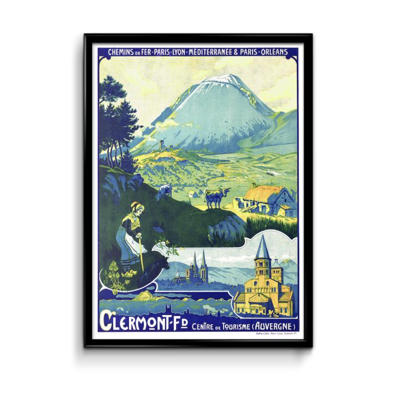 Reproduction d'une affiche ancienne parue vers 1890 faisant la promotion du tourisme en Auvergne et à Clermont-Ferrand. Un paysage typique auvergnat de l'époque, avec une ferme et des vaches en premier plan, accompagne cette vue sublime illustrée du Puy de Dôme.