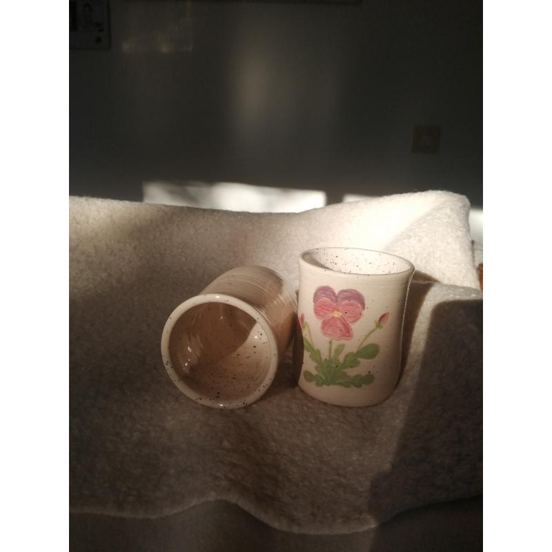 lot de 2 gobelets en faïence motif fleur de pensée (entre 15 et 20cl).