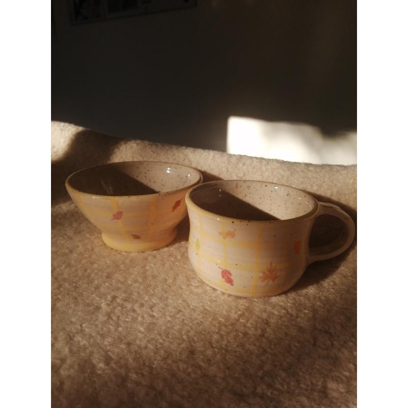 lot d'une tasse et d'un bol format petit (15cl environ) aux motifs d'automne, feuilles et citrouilles dans le fond des pièces.