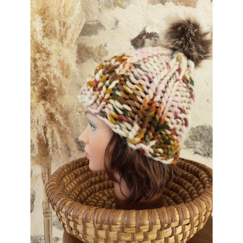 Ses coloris d’automne sont aléatoirement répartis, surmontés d’un pompon fausse fourrure.