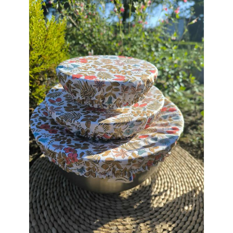Couvre-bols réutilisable en coton enduit : propre, rapide, joli. Zéro film jetable au frigo.
