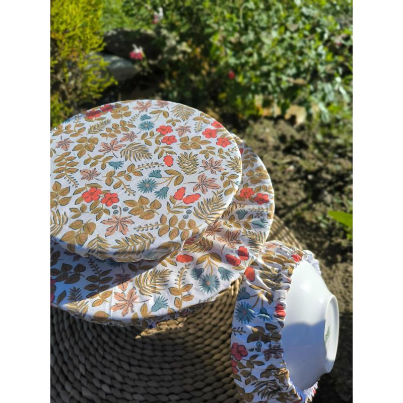 Son coton enduit déperlant se tend grâce au bord élastiqué pour couvrir bols, saladiers ou plats ronds. Idéale pour conserver un reste au réfrigérateur, protéger une pâte en levée ou transporter un plat. Le motif feuillage pastel sur fond blanc apporte une note lumineuse à la cuisine.