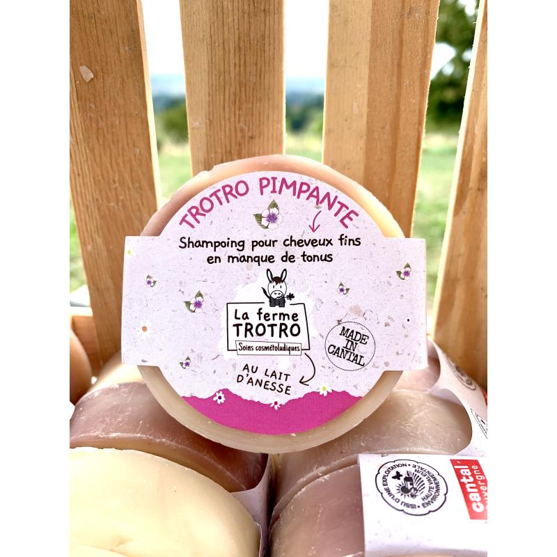 Shampoing solide Trotro Pimpante au lait d'ânesse, avec de l'huile de ricin bio et de la fleur de guimauve du Cantal pour des cheveux brillants plein de tonus - idéal pour pimper les cheveux fins !