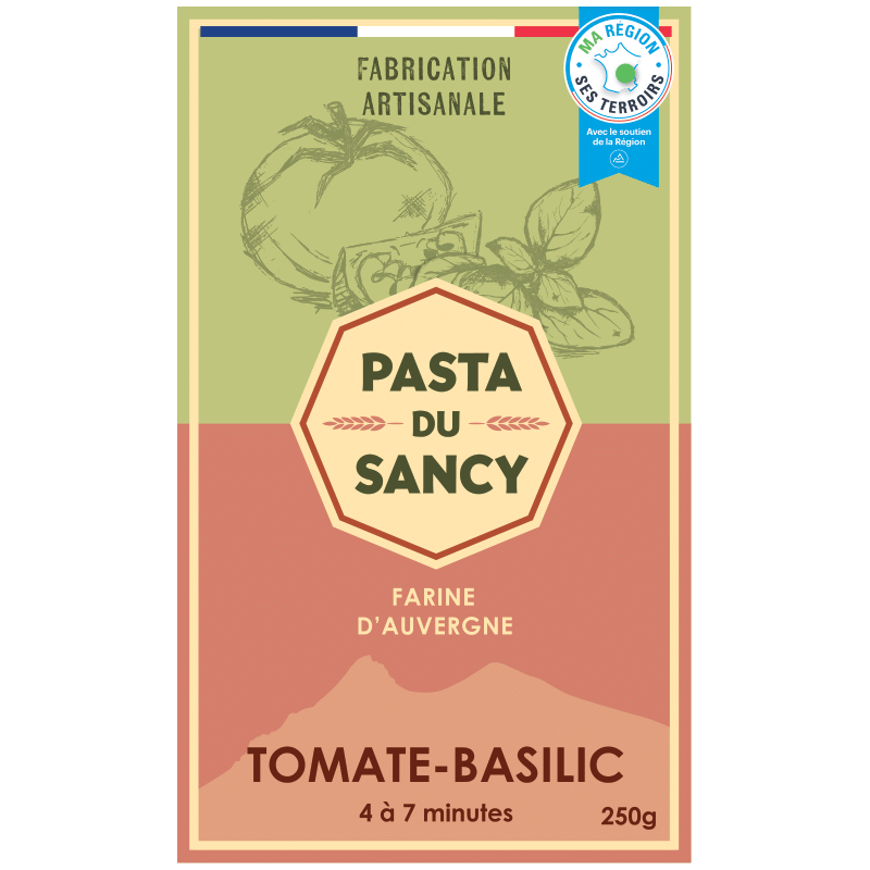 Ingrédients : Farine de blé tendre locale (gluten), eau, basilic (1,5%), poudre de tomates (1,5%).