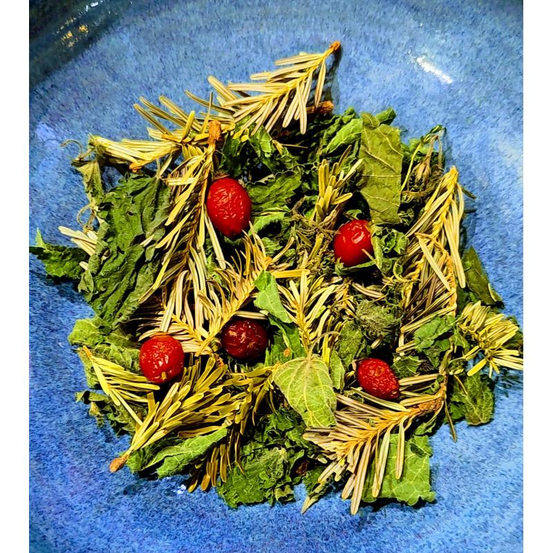 Jeunes pousses de sapin, feuilles d'ortie, églantines. Tisane pour se préparer à l'hiver et faire le plein d'énergie avant la saison froide. Une boisson chaude relevée et haute en couleurs pour se réchauffer avant de pointer le nez dehors.