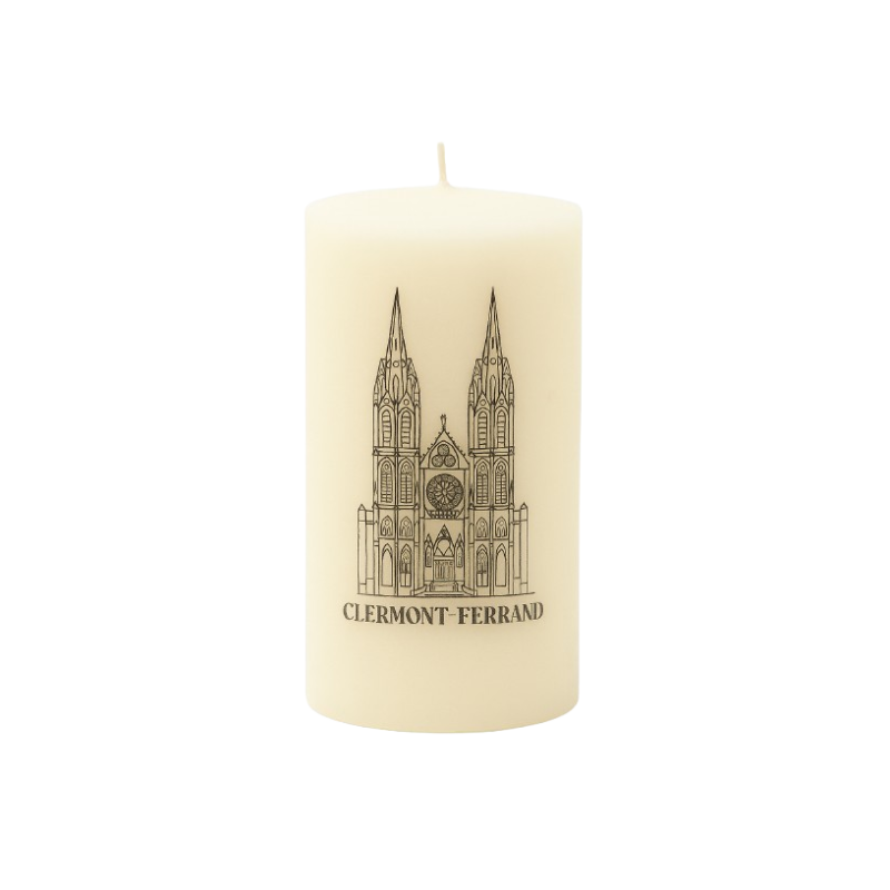 Apportez une touche élégante et locale à votre décoration avec cette bougie pilier en cire végétale, ornée d’une illustration fine de la Cathédrale de Clermont-Ferrand.