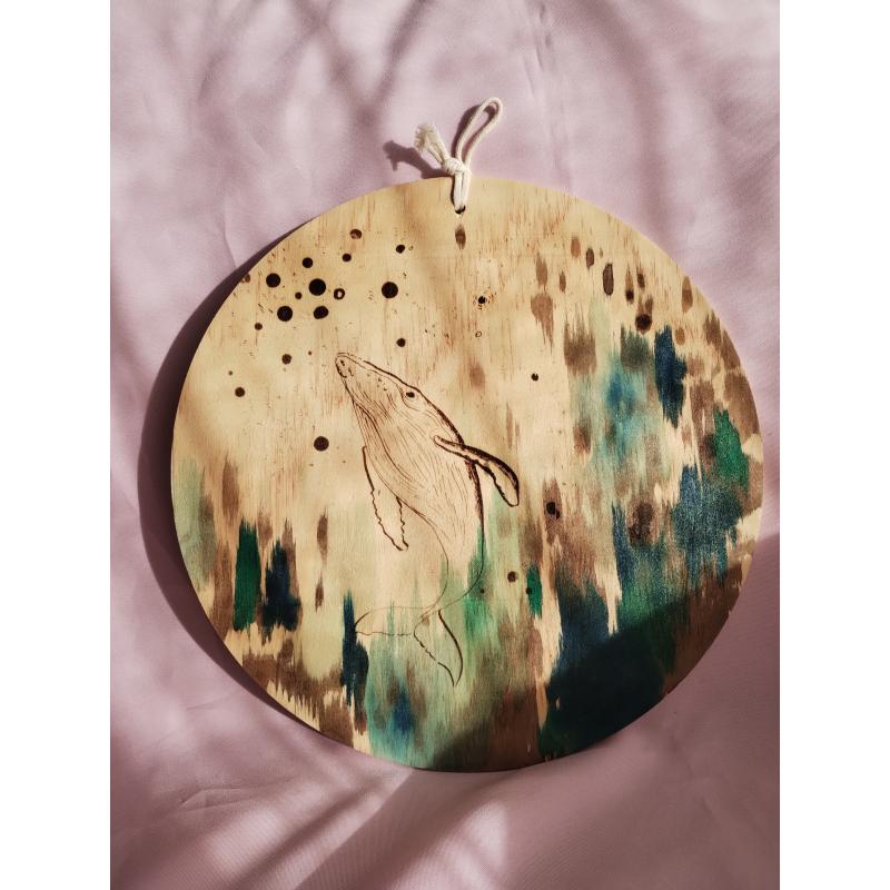 Décoration à suspendre, dessin de baleine gravée sur une planche ronde.