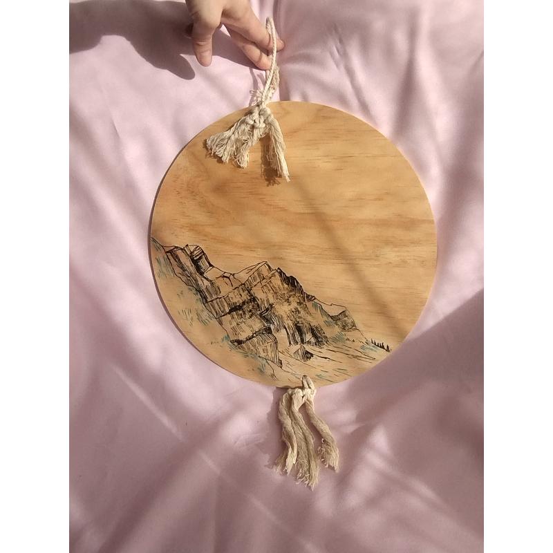 Décoration à suspendre, dessin d'une chaîne de montagnes sur bois.