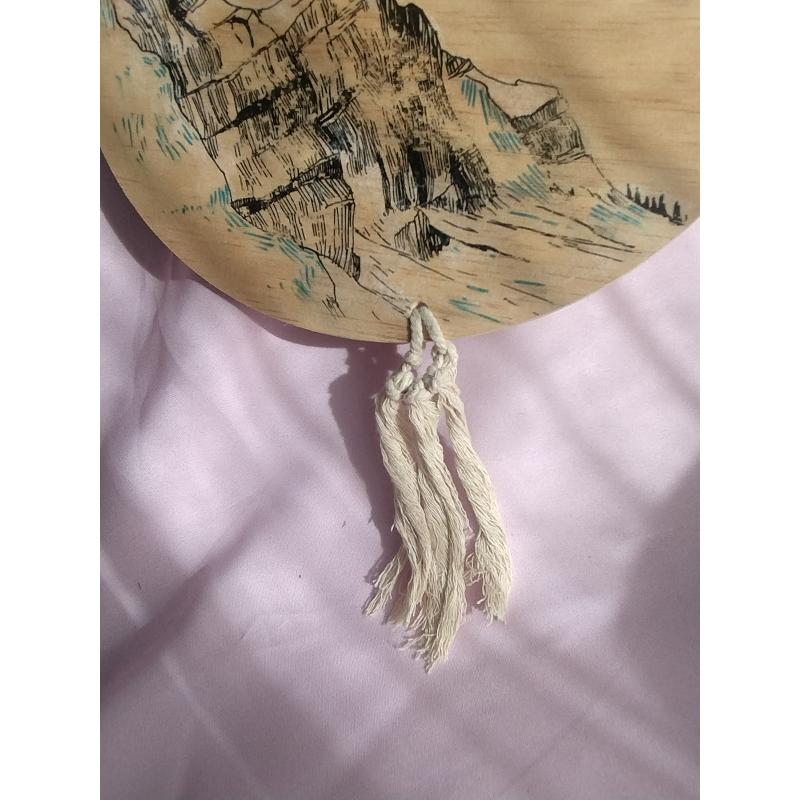 Illustration transférée sur une planche de contre-plaqué en bois clair. Macramé en fil de coton.