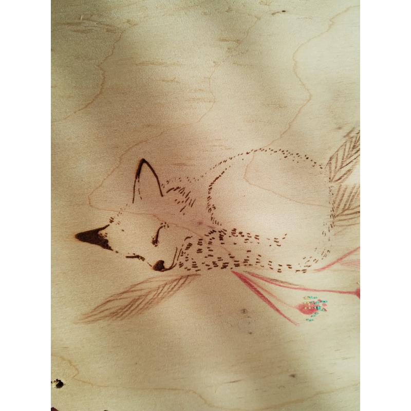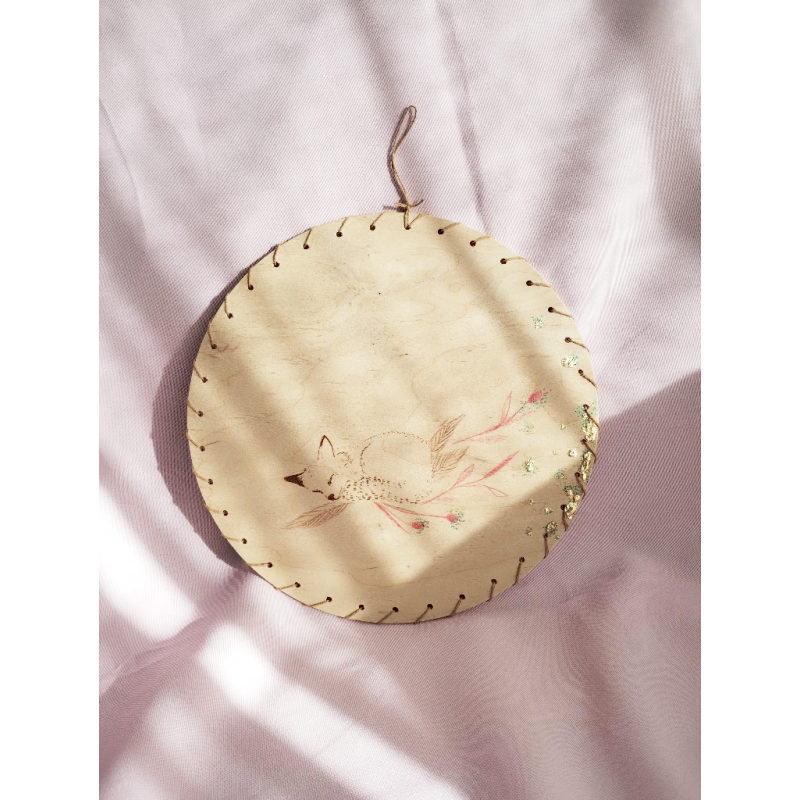 Décoration en bois avec gravure d'un petit renard assoupi.