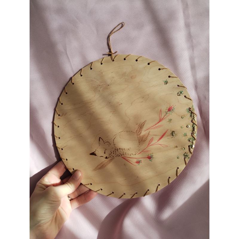 Illustration gravée sur un cercle de bois clair. Ajout d'éléments à la main directement sur le bois, feuilles à dorer, dessin au crayon. Fils entrelacé dans le bois, en coton.