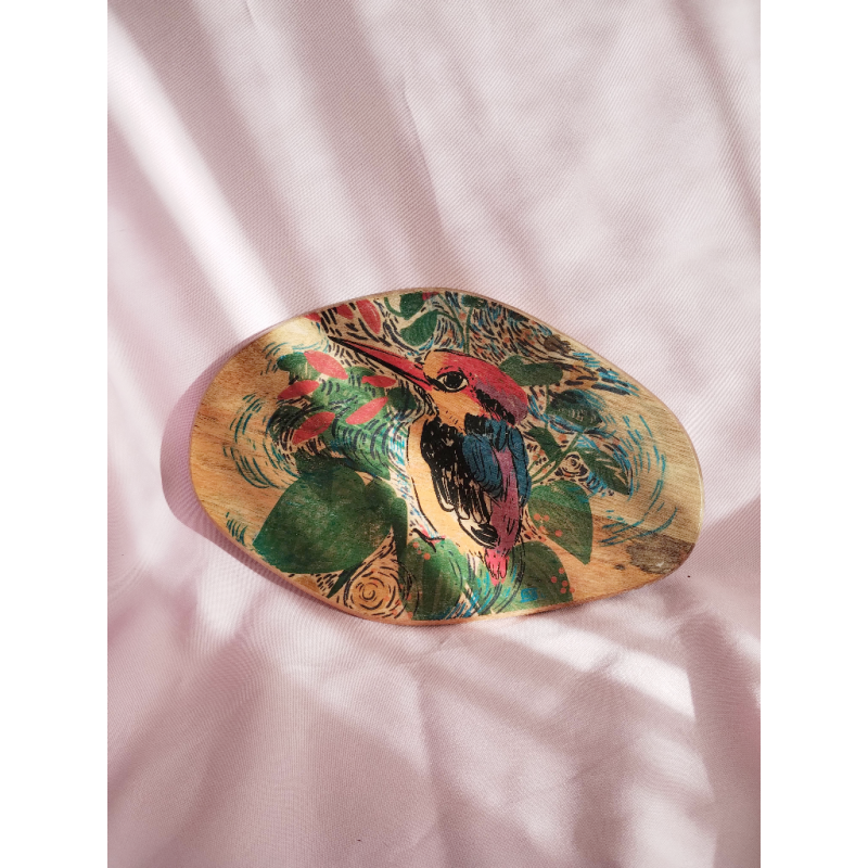 Jolie décoration colorée sur bois, avec illustration d'un martin-pêcheur pygmée.