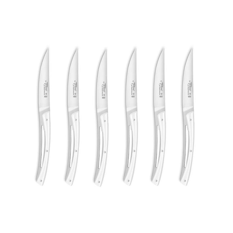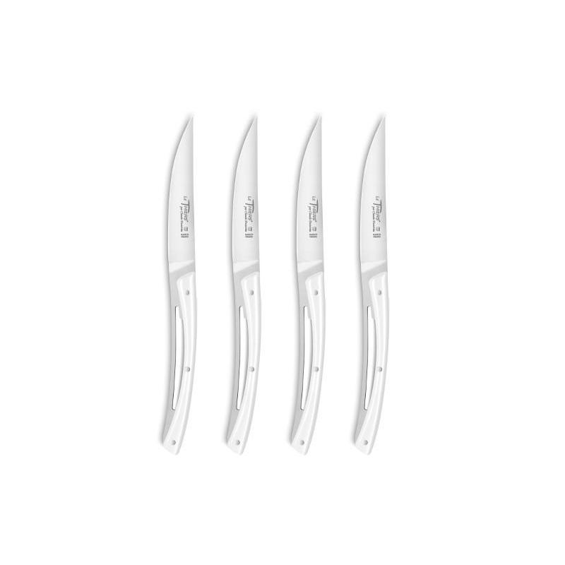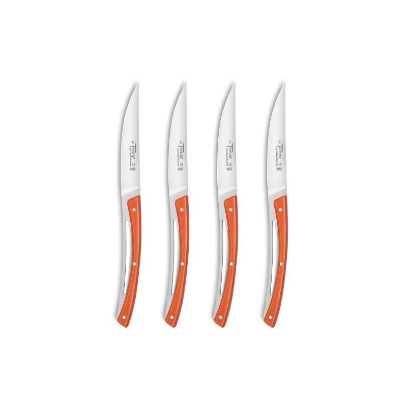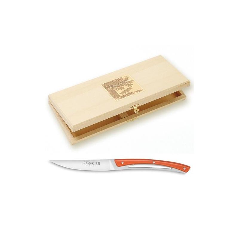 Le manche de ces couteaux est disponible en méthacrylate blanc ou orange, bois d’olivier ou micarta. Les couteaux colorés vous permettront de dresser de belles tables festives.