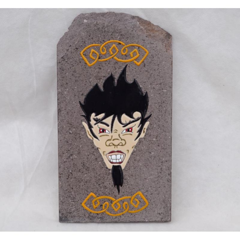 Tableau représentant un personnage malicieux avec un décor d'entrelacs, sur un fond pierre, dimensions 26x15 cm, à accrocher. Création unique et faite avec passion par l'artisan émailleur sur lave. Un souhait de personnalisation? Une question concernant la livraison? N'hésitez pas à contacter l'artisan en direct au 06.02.13.24.59 ou par mail : emailetmerveilles@gmail.com