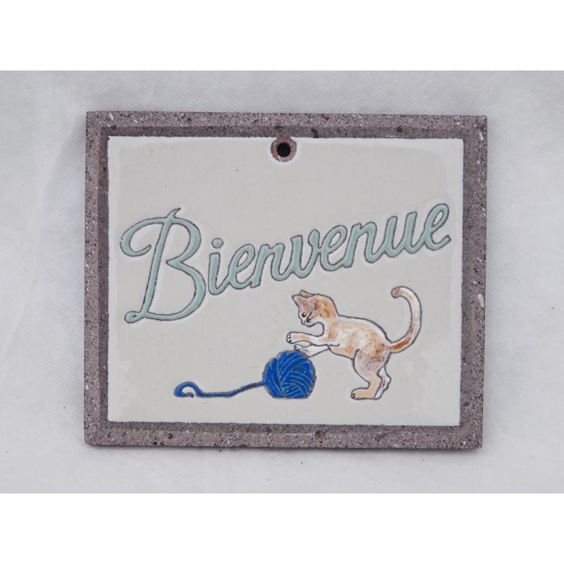 Décoration en lave émaillée "bienvenue" avec des lettres vert amande, un décor de petit chat qui joue avec une pelote, sur un fond beige, à visser, dimensions environ 18x15 cm. Création unique et faite avec passion par l'artisan émailleur sur lave. Un souhait de personnalisation? Une question concernant la livraison? N'hésitez pas à contacter l'artisan en direct au 06.02.13.24.59 ou par mail : emailetmerveilles@gmail.com